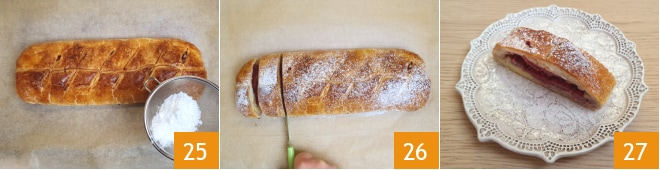 Quand il sera bien doré, sortez le strudel du four et laissez refroidir, puis saupoudrez de sucre glace selon votre goût 25. Coupez en tranches votre délicieux strudel à la crème pâtissière et aux fraises 26 et servez 27 !