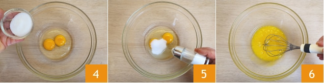Versez l'œuf et le jaune dans un bol avec le sucre 4 et une pincée de sel 5 puis mélangez brièvement au fouet à main pour amalgamer le sucre 6.