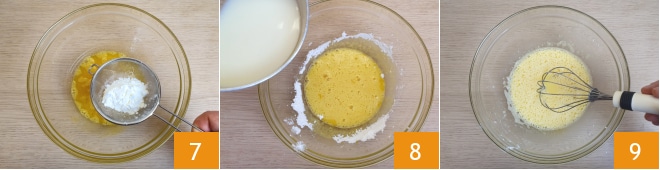 Tamisez la maïzena dans le bol 7, puis retirez le zeste de citron de la casserole et versez la moitié du lait chaud dans le mélange de jaunes 8, en mélangeant toujours avec le fouet 9.