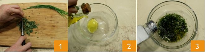 Pour préparer le plat de champignons savoureux, commencez par le hachis d'herbes qui servira à les assaisonner : hachez le persil 1, la ciboulette, l'origan, et la gousse d'ail. Puis dans un petit bol, versez un filet d'huile 2, ajoutez le hachis d'herbes aromatiques, salez 3 et poivrez à volonté.