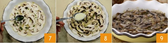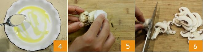Graissez un plat à gratin de 25 cm de diamètre avec un filet d'huile et saupoudrez de chapelure. Puis passez à la préparation des champignons de Paris (vous pouvez également consulter l'école de cuisine : préparation des champignons de Paris). Coupez les racines des champignons, puis frottez-les avec un torchon propre pour éliminer la terre ; puis coupez-les en tranches assez fines 6.