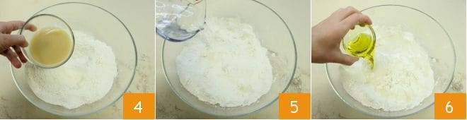 Ensuite, ajoutez la levure et le malt dissous dans l'eau dans le bol avec la farine 4, puis versez également l'eau dans laquelle vous avez dissous le sel 5. Ajoutez enfin l'huile d'olive 6.