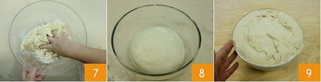 Ensuite, commencez à pétrir dans le bol 7, transférez la pâte sur un plan fariné et pétrissez encore jusqu'à ce qu'elle soit homogène et élastique. Ensuite, placez-la dans un bol 8 et couvrez-la avec un film plastique adapté au micro-ondes, puis mettez le bol dans le micro-ondes Smart Oven Samsung et réglez le programme de levée automatique 1-3 (900 gr de poids max), la pâte doublera ainsi de volume 9.
