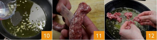 Pendant que la pâte lève, préparez la farce : dans une grande poêle, faites revenir l'ail haché avec l'huile 10. Entre-temps, retirez la peau de la saucisse 11, puis mettez la chair en morceaux dans la poêle 12 et faites-la cuire en ajoutant le fenouil sauvage et en déglacant avec le vin rouge. Salez, poivrez à votre goût et faites cuire environ 10 minutes.