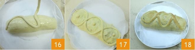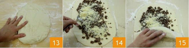 À la fin du programme de levée, reprenez la pâte et étalez-la sur un plan de travail fariné 13 en lui donnant une forme ovale ; puis versez dessus le ragoût de saucisse blanche en laissant quelques centimètres du bord et saupoudrez avec le fromage râpé 14. Commencez à rouler le strudel du côté le plus petit 15.