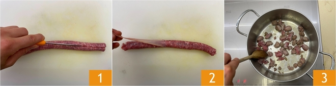 Pour préparer le strudel en pâte filo aux saucisses et aux épinards, commencez par inciser la saucisse dans la longueur 1 et retirer le boyau 1. Dans une casserole, faites chauffer un peu d'huile et ajoutez la saucisse émiettée 3.<\/p>