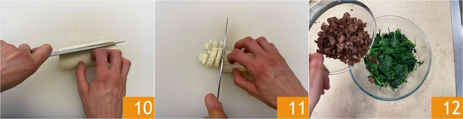 Coupez le fromage filant d'abord en bâtonnets 10 puis en dés 11. Dans un bol, mélangez les épinards et la saucisse 12.<\/p>