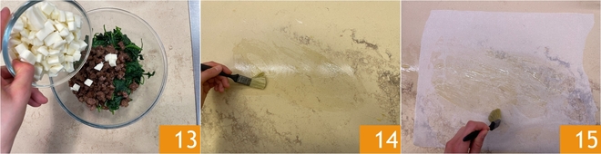 Ajoutez les dés de fromage à la garniture 13 et mélangez. Badigeonnez d'huile le plan de travail 14, puis étalez une feuille de papier cuisson de façon qu'elle adhère bien. Badigeonnez aussi la feuille de papier cuisson 15. <\/p>