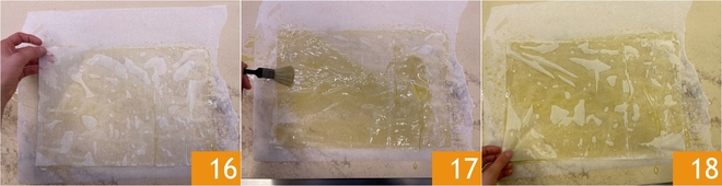 Posez dessus le premier feuillet de pâte filo 16 et badigeonnez-le d'huile 17, puis ajoutez un second feuillet de pâte filo 18 et faites-le bien adhérer.<\/p>