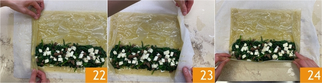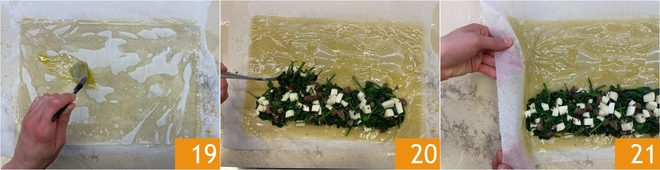 Procédez de la même manière avec les 6 feuilles de pâte filo. Badigeonnez d'huile la dernière couche 19 et garnissez la moitié inférieure avec la farce, en prenant soin de laisser une bordure libre 20. Maintenant refermez la pâte : soulevez le papier cuisson pour replier légèrement le côté court 21. <\/p>