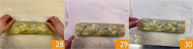 Scellez bien la zone de fermeture avec une légère pression 28. Pratiquez 5 incisions en diagonale sur la surface 29 et garnissez de graines de sésame blanches et noires 30 et de graines de pavot. <\/p>
