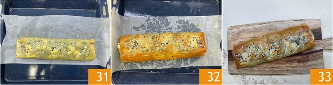 Transférez le strudel sur une plaque, la fermeture vers le bas 31. Faites cuire dans un four statique préchauffé à 200 b0 pendant 20 minutes. Sortez du four 32 et laissez tiédir. Le strudel en pâte filo aux saucisses et aux épinards est prêt à être dégusté 33 !<\/p>