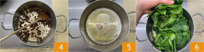 Faites revenir la saucisse jusqu'à ce qu'elle soit dorée 4, puis transférez-la dans un bol. Dans la même poêle, chauffez un filet d'huile avec une gousse d'ail 5, puis ajoutez les feuilles d'épinards 6. <\/p>