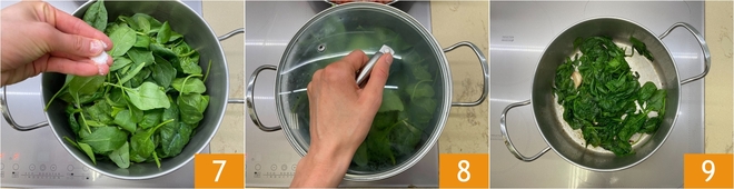 Salez 7, couvrez 8 et poursuivez la cuisson environ 3 minutes à feu moyen, ou jusqu'à ce que les épinards soient tendres. À ce stade, retirez le couvercle et poursuivez la cuisson une minute supplémentaire pour les assécher 9. <\/p>
