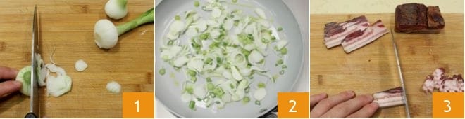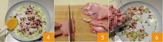 et ajoutez-la aux oignons nouveaux 4, en faisant bien revenir. Coupez le filet de porc en lanières 5, ajoutez-les également aux oignons et à la pancetta jusqu'à ce qu'ils soient dorés 6.