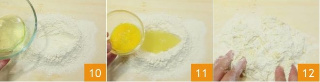 en y ajoutant ensuite l'huile et incorporez le mélange obtenu à la farine 10. Ajoutez également l'œuf battu 11 et pétrissez les ingrédients 12.