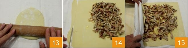 Lorsque vous avez obtenu une pâte homogène et élastique, étalez-la avec un rouleau à pâtisserie sur un torchon 13, qui servira à enrouler ensuite le strudel. Étalez une feuille d'épaisseur de 2-3 mm, mesurant environ 40 x 40 cm. Répartissez-y le mélange maintenant refroidi en laissant 2-3 cm des bords et peaufinez avec la pointe d'un couteau pour donner une forme plus régulière 14. Badigeonnez à ce stade les bords avec de l'eau et enroulez, à l'aide du torchon, le strudel 15.