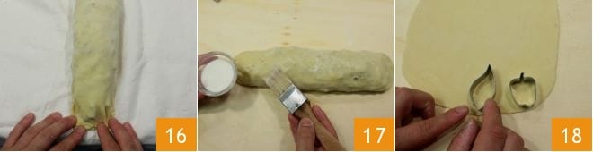Scellez bien tous les bords de manière à ce que la farce ne s'échappe pas 16. Placez-le au réfrigérateur pendant 10-15 minutes. Après ce temps de repos, sortez le strudel du réfrigérateur et badigeonnez-en la surface avec du lait, en vous aidant d'un pinceau de cuisine 17. Vous pouvez maintenant créer avec le reste de la pâte des décorations pour embellir le strudel : découpez des petites feuilles et des petites pommes à l'aide d'emporte-pièces 18,