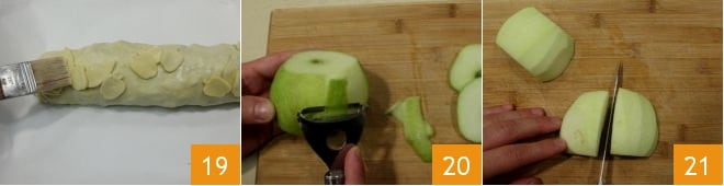 répartissez-les ensuite sur le strudel et badigeonnez encore le tout avec du lait 19. Faites cuire au four préchauffé à 200°C pendant 30 minutes (si ventilé, à 180°C pendant 20 minutes), sur la grille du milieu, jusqu'à obtenir une belle dorure. Pendant ce temps, occupez-vous de l'accompagnement. Épluchez la pomme en éliminant le trognon 20, puis coupez-la en quartiers 21.
