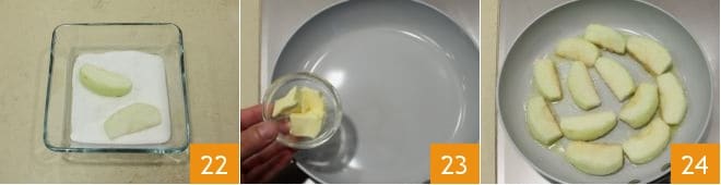 Mettez maintenant le sucre dans un bol et passez-y les quartiers obtenus, des deux côtés 22. Faites fondre doucement le beurre dans une casserole 23 et ajoutez ensuite les pommes sucrées 24, en les disposant soigneusement. Faites-les dorer des deux côtés.
