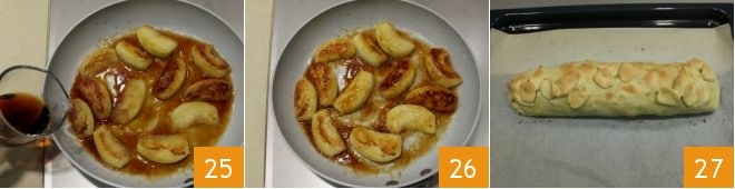 Arrosez-les à ce stade avec le marsala 25 et laissez-le s'évaporer en veillant à ce qu'il sèche sans brûler 26. Sortez enfin le strudel du four, que vous pouvez présenter entier ou en tranches accompagné des pommes tièdes 27.