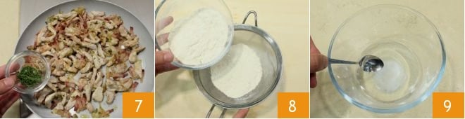 Assaisonnez de sel, de poivre et terminez en ajoutant également le thym 7. Laissez refroidir la farce dans un bol. Continuez avec la préparation de la pâte pour le strudel. Tamisez la farine sur un plan de travail et formez la classique fontaine avec un creux au centre 8. Faites dissoudre le sel dans l'eau 9