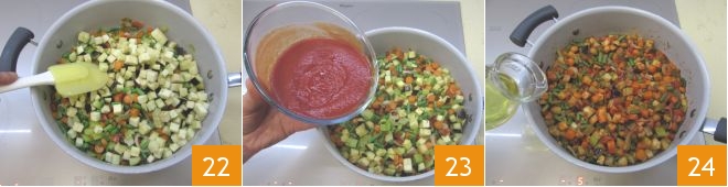 Laissez cuire encore 5 minutes, avant d'ajouter les aubergines 22. Après quelques minutes, versez la purée de tomates 23. Arrosez avec le bouillon de légumes 24 et laissez cuire à feu doux pendant 30-40 minutes.