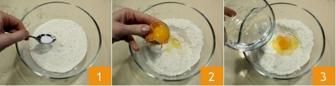 Pour préparer le strudel salé avec jambon, champignons et fontine, commencez par la pâte : dans un bol, versez la farine tamisée, ajoutez le sel 1 puis l'œuf 2. Ensuite, versez aussi l'eau 3.