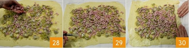 Enfin, répartissez les dés de jambon cuit 28. Badigeonnez les bords avec du blanc d'œuf 29 ou de l'eau. Ensuite, en vous aidant du torchon, commencez à rouler le strudel sur lui-même 30 en partant du côté le plus court et en laissant la fermeture sur le dessous.