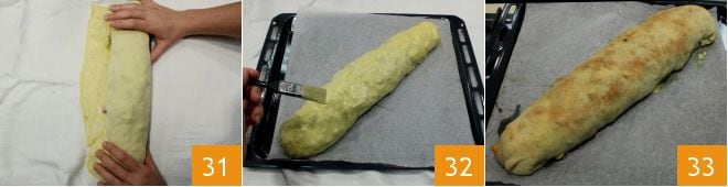 Terminez de rouler le strudel sur lui-même 31 et repliez les deux extrémités de la pâte sous le strudel lui-même. Placez le strudel sur une plaque recouverte de papier sulfurisé et badigeonnez la surface du strudel avec de l'huile d'olive extra vierge 32 ; enfournez dans un four statique préchauffé à 180° pour 40 minutes (si four ventilé 160° pour 30-35 minutes). Une fois cuit, sortez-le du four 33 et laissez-le tiédir sur une grille, puis coupez-le et servez-le !