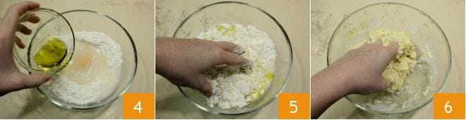 Ajoutez aussi l'huile 4 et ensuite commencez à pétrir 5 ; travaillez le mélange dans le bol jusqu'à ce que les liquides soient absorbés et que la pâte ait pris forme 6.