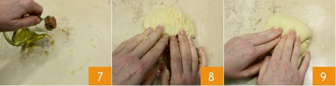 Maintenant, huilez légèrement la surface de travail 7 ou la planche à pâtisserie et transférez la pâte. Manipulez-la 8 jusqu'à ce qu'elle devienne lisse et élastique 9.