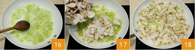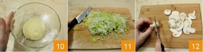 Faites une boule avec la pâte, placez-la dans un bol et couvrez-la avec un film plastique 10. Laissez reposer la pâte dans un endroit frais pendant au moins 30 minutes. Pendant ce temps, préparez la garniture : nettoyez le poireau en éliminant les barbes et la partie verte, puis décollez la couche la plus externe et émincez-le finement 11. Ensuite, nettoyez les champignons de Paris (pour cette opération, vous pouvez consulter la fiche comment nettoyer les champignons de Paris) : lavez-les sous l'eau courante, puis séchez-les avec un torchon ou du papier absorbant pour éliminer d'éventuelles traces de terre et émincez finement les chapeaux 12.