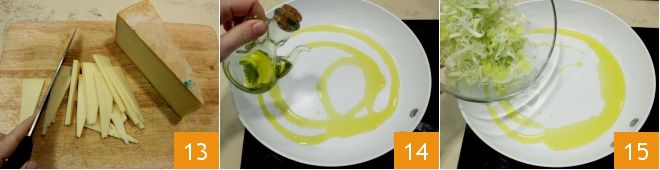 Émincez aussi la fontine 13 et retirez la croûte. Puis, dans une grande poêle, versez un filet d'huile et ajoutez le poireau émincé précédemment 15.