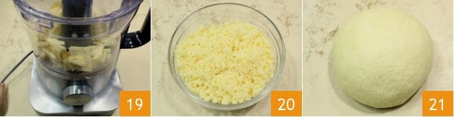 Pendant que les champignons cuisent, mettez les morceaux de fontine dans le mixeur et mixez-les, puis rassemblez-les dans un bol 20. Maintenant que vous avez les ingrédients prêts pour la garniture, reprenez la pâte du strudel pour l'étaler 21