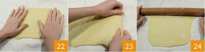Prenez un torchon propre et posez-le sur le plan de travail : saupoudrez-le de farine et commencez à étaler votre pâte 22 ; élargissez-la légèrement avec les doigts 23 et ensuite commencez à l'étaler avec un rouleau à pâtisserie 24, en farinant aussi la partie supérieure de la pâte.