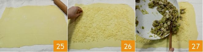 Travaillez avec le rouleau à pâtisserie jusqu'à ce que vous obteniez un rectangle de 50x35 cm 25. Saupoudrez-le avec les ingrédients de la garniture en laissant environ 3 cm du bord : ajoutez d'abord la fontine hachée 26, puis le mélange de poireaux et champignons 27.