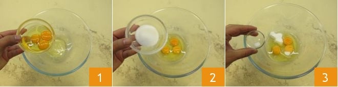 Pour préparer les struffolis aux fruits rouges, commencez par préparer la pâte. Cassez les œufs dans un grand bol 1, ajoutez le sucre 2 et une pincée de sel 3.