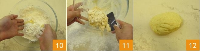 et commencez à travailler la pâte avec les mains, toujours dans le bol 10. Dès qu'elle devient assez ferme, transférez-la sur un plan de travail bien fariné 11 et continuez à pétrir avec les mains, juste le temps d'obtenir un résultat lisse et homogène 12.