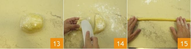 A ce stade, enveloppez votre pâte dans du film alimentaire 13 et placez-la au réfrigérateur pour reposer pendant une heure. Une fois le temps écoulé, reprenez la pâte et saupoudrez-la de farine, juste assez pour faciliter le travaille de la pâte 14. Avec cette pâte, formez des rouleaux d'environ 1 cm d'épaisseur, en allongeant chaque morceau de pâte 15 et en le tapant légèrement sur le comptoir en le tenant par les extrémités, pour rendre la pâte plus élastique et l'allonger plus facilement.