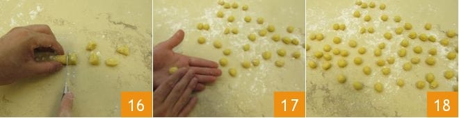 À l'aide d'un couteau, découpez dans chaque rouleau des gnocchis d'environ un demi-cm de large 16. Ensuite, en utilisant la paume de la main, faites rouler chaque petit morceau de pâte un à un 17 pour leur donner une forme sphérique 18, typique des struffolis.