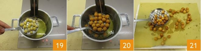 A ce stade, vous pouvez vous occuper de la friture. Faites chauffer l'huile de graines dans une casserole pour atteindre la température de 170° et seulement lorsque l'huile est chaude, à l'aide d'une écumoire, laissez glisser les morceaux de pâte dans l'huile chaude 19. Pour ne pas trop faire baisser la température de l'huile, il est conseillé de cuire quelques pièces à la fois. Retournez vos struffolis de temps en temps à l'aide d'une écumoire et dès qu'ils sont bien dorés, retirez-les de l'huile (cela prendra environ 5 minutes) 20 et transférez-les sur un plateau recouvert de papier pour friture 21.