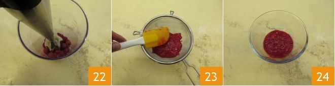 Une fois les struffolis frits, passez à la préparation du glaçage. Pour commencer, mixez les framboises à l'aide d'un mixeur plongeant 22; puis filtrez la pulpe 23 pour obtenir une purée lisse 24.