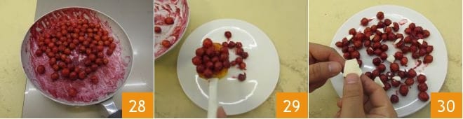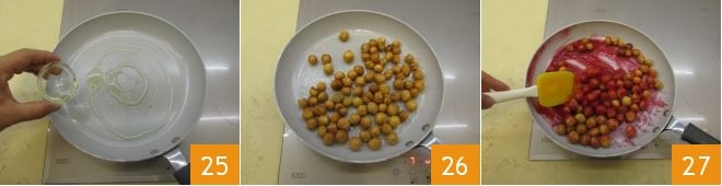 Versez le miel dans une poêle chaude mais pas brûlante 25, ajoutez les struffolis et mélangez avec une spatule jusqu'à ce qu'ils soient complètement enrobés de miel 26. Ajoutez la purée de framboises fraîchement tamisée et mélangez pour enrober les struffolis de manière uniforme 27.