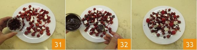 Ajoutez des framboises déshydratées 31 puis terminez le plat avec un peu de chocolat fondu 32, quelques framboises fraîches et servez vos struffolis aux fruits rouges 33 !