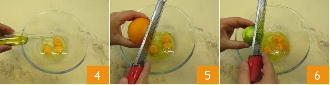 Ajoutez également un filet d'huile 4, un zeste d'orange râpé (environ 1/4 nécessaire) 5, et un zeste de citron vert râpé 6.