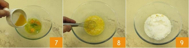 Ajoutez ensuite le jus de l'orange 7 et commencez à mélanger le tout avec un fouet 8. Versez la farine d'un seul coup dans le mélange 9