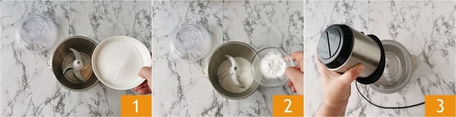 Pour préparer le sucre glace fait maison, vous aurez besoin d'un mixeur, doté de lames, très puissant. Versez à l'intérieur le sucre 1 et la maïzena 2. Mixez le tout pendant environ 2 minutes 3. Puis arrêtez-vous, afin de laisser refroidir les lames, et mixez encore pendant quelques minutes.
