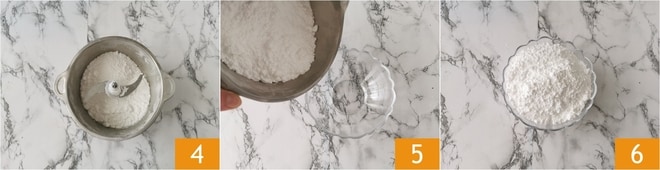 À ce stade, vous aurez obtenu une poudre fine, aérée et palpable 4. Transférez-la dans un bol 5 et le sucre glace est prêt 6.