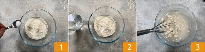 Pour préparer les supplì cacio e pepe, commencez par la pâte à frire : dans un bol, versez la farine, le sel 1 et l'eau 2, puis mélangez bien avec un fouet 3. Mettez de côté.
